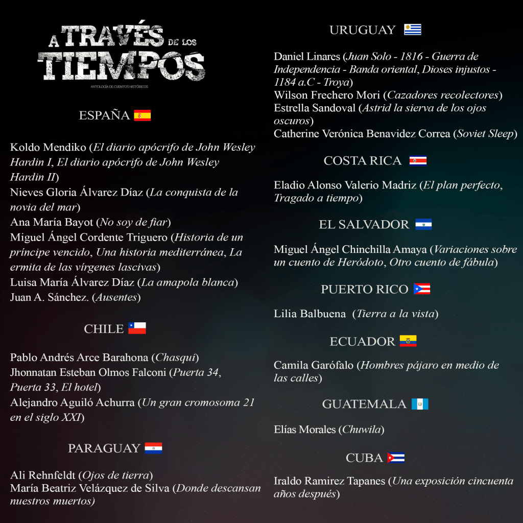 Para reunir esta colección de cuentos, se recurrió a 54 autores de diferentes países. Están presentes Argentina, México, Colombia, España, Chile, Paraguay, Uruguay, Costa Rica, El Salvador, Puerto Rico, Ecuador, Guatemala y Cuba. Estos autores debieron enfrentarse a un notable desafío. No es un género para nada sencillo, ya que debieron situarse en épocas y civilizaciones remotas y reconstruir sus costumbres, pensamientos y motivaciones. Otros se enfocaron en figuras de gran peso histórico y debieron adoptar su personalidad y su carácter. Pero algo es seguro, cada uno de estos autores supo jugar con el tiempo con destreza y transportarnos a su antojo.