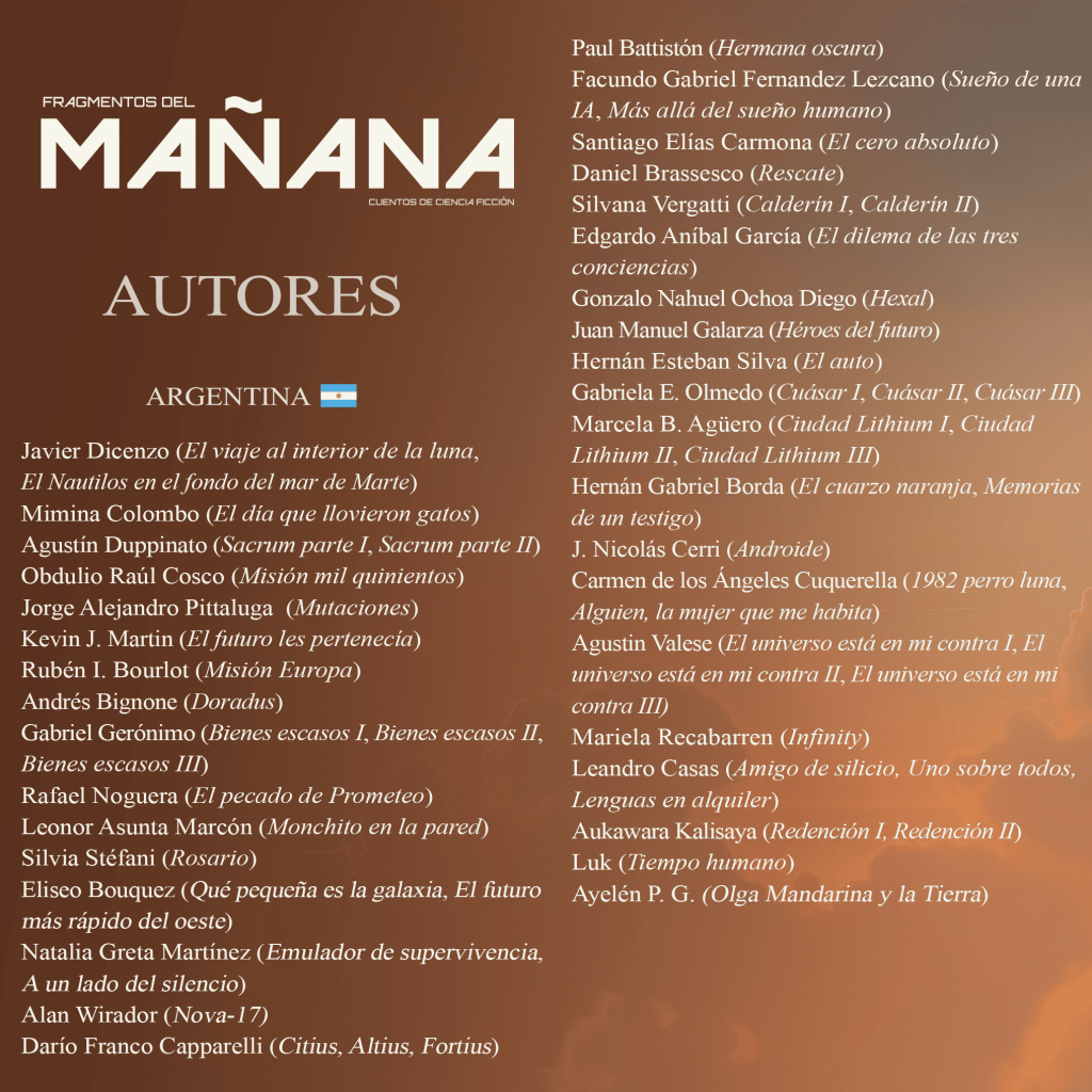 Conoce a los autores de Fragmentos del mañana y sus cuentos. Representantes de Argentina, México, España, Uruguay, Chile, Ecuador, Colombia, Cuba, Paraguay y Perú se reúnen para brindarnos una galaxia repleta de historias increíbles.