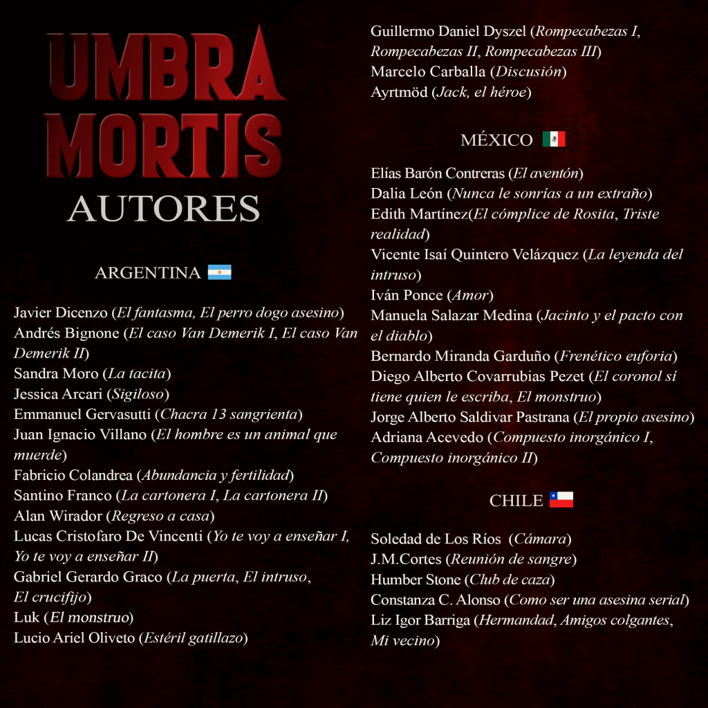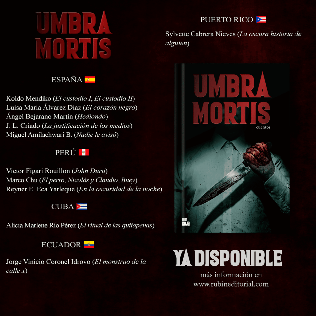 A partir de mañana ya estará disponible el libro Umbra Mortis, una antología de 57 cuentos de terror criminal, slasher y gore. Que será publicado por Luna Roja, el sello de terror y misterio de Grupo Editorial Rubin.